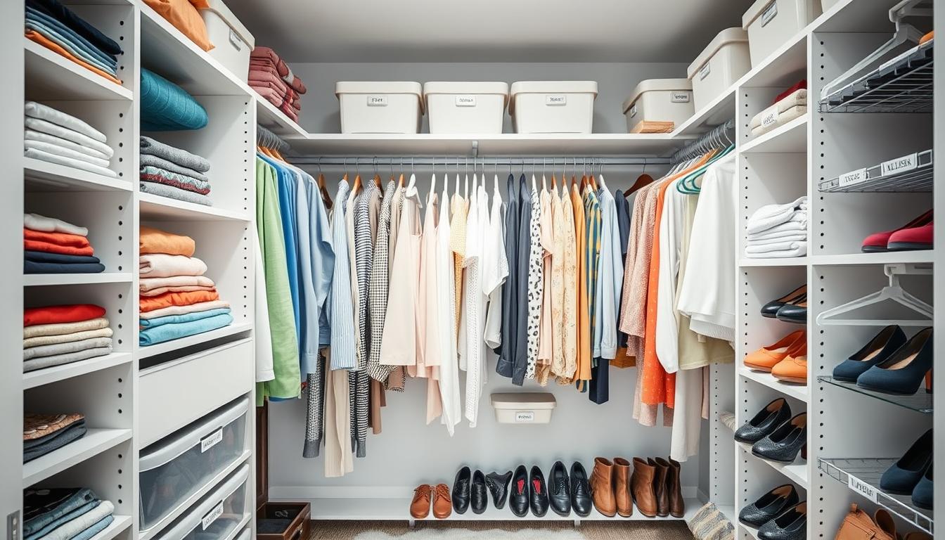 Creating a closet organization system is key. A color-coded closet is both pretty and organized. It groups similar colors together, making it easy to find clothes. Using closet storage like colored bins adds to the system.